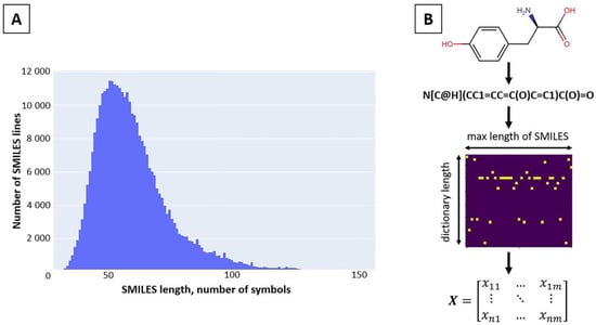 The generated library of chemical compounds in the SMILES linear notation was purified from molecules that had a molecular weight more than 1000 Da, duplicates, and incorrect SMILES records. The representations of chemical structures in the SMILES format were obtained by the Python 3 script using the RDKit module []. Molecules containing at least one SMILES element with a frequency less than 0.001 were filtered out based on the frequency distribution of SMILES elements in the generated dataset. The distribution of SMILES lengths was then analyzed, and compounds with the SMILES representation longer than 120 characters were removed (Figure 6A). After applying all the filters, the dataset included 342,102 different molecules and corresponding SMILES. The SMILES were vectorized into a matrix in accordance with the maximum length and symbols’ vocabulary size (Figure 6B), with the added start and end symbols represented by “!” and “E”.