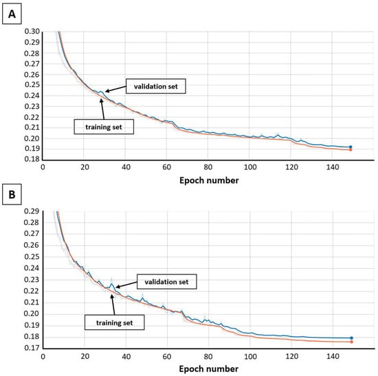 Both models were constituted layer by layer by TensorFlow 2.1 [] and exposed to 150 epochs of training; additionally, “Reduce learning rate on a plateau” and “Early stopping” callbacks were applied to assist the model’s convergence to a better local minimum and also to avoid overfitting. The optimizer used a method for stochastic optimization Adam [], with the 0.005 learning rate initial value. At the same time, the categorical cross-entropy loss function [] was used. The loss functions for both models are shown in Figure 8.