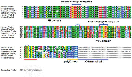 Sequence alignment of Phafin proteins. Amino acid sequences corresponding to Homo sapiens Phafin1 (UniProt accession number Q96S99), Mus musculus Phafin1 (UniProt accession number Q3TB82), Drosophila melanogaster Phafin1 (UniProt accession number O76902), Danio rerio Phafin2 (UniProt accession number Q7ZUV1), Homo sapiens Phafin2 (UniProt accession number Q9H8W4), and Mus musculus Phafin2 (UniProt accession number Q91WB4) were aligned using Clustal Omega. Sequence alignment is shown and colored using MView and structural and functional elements are underlined (PH domain, black; FYVE domain, red; polyD motif, yellow; and C-terminal tail, blue). The putative PtdIns(3)P-binding sites in the PH and FYVE domains are marked by braces. Of note, three conserved sequences, the N-terminal WxxD, the central RR/KHHCR, and the C-terminal RVC motifs in the FYVE domain form a compact PtdIns(3)P-binding site.