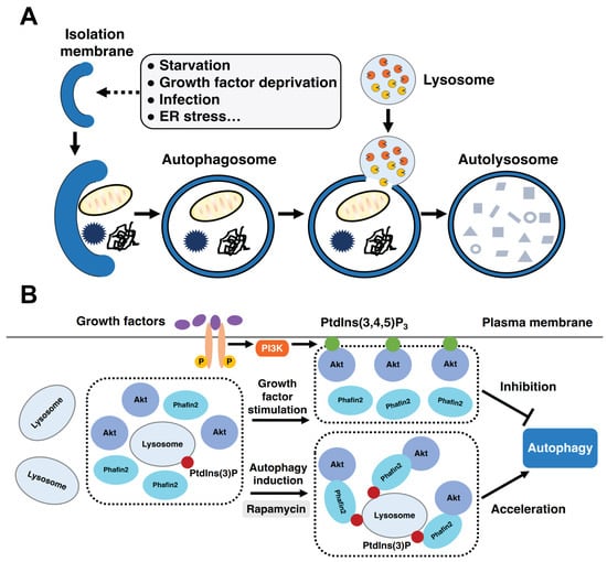 Based on their different mechanisms and functions, there are three primary types of autophagy: microautophagy, macroautophagy, and chaperone-mediated autophagy [,]. In microautophagy, cytoplasmic components are directly engulfed by lysosomes through the invagination of the lysosomal membrane. In the case of macroautophagy (often referred to as autophagy), a unique membrane structure, called the isolation membrane or phagophore, emerges after autophagy induction. The isolation membrane expands and elongates to form autophagosomes, which are double-membrane vesicles that engulf cytosolic components. Autophagosomes fuse with lysosomes resulting in the formation of autolysosomes. Lysosomal hydrolytic enzymes digest the autolysosomal contents, and the resulting degradation products are transported back to the cytosol through membrane permeases (Figure 3A) []. Chaperone-mediated autophagy relies on the action of cytosolic and lysosomal Hsc70 chaperone, which recognizes the soluble cytosolic proteins carrying the pentapeptide KFERQ-like sequence []. The Hsc70 chaperone associates with the integral membrane receptor LAMP-2A (lysosome-associated membrane protein type 2A), which translocates substrate proteins across the lysosomal membrane []. Autophagy plays a key role in cellular adaptation to changing environmental conditions, cellular remodeling during development and differentiation, and lifespan determination []. Autophagic dysfunction is associated with a plethora of human diseases, such as cancer [], neurodegeneration [], microbial infection [], myopathies [], and aging [].