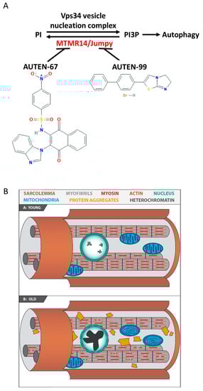 Mechanisms by which AUTEN-67 and -99 activate autophagy. (A) AUTEN-67 and -99 can induce autophagic degradation through interfering with MTMR14/EDTP. Converting PI into PI3P is an essential step for the formation of the autophagic isolation membrane. This process is catalyzed by the Vps34 kinase complex. In mammals, MTMR14/Jumpy antagonizes with the complex. MTMR14/Jumpy is a shared target of the two AUTEN molecules used in this study. EDTP, the Drosophila orthologue of MTMR14/Jumpy, can also be blocked by these AUTEN molecules. (B) Striated muscle from a young and an old animal. In the old specimen, protein aggregates (yellow) and damaged mitochondria containing abnormal internal lamellas (blue) accumulate, and there are nuclei with a highly condensed chromatin structure (green).