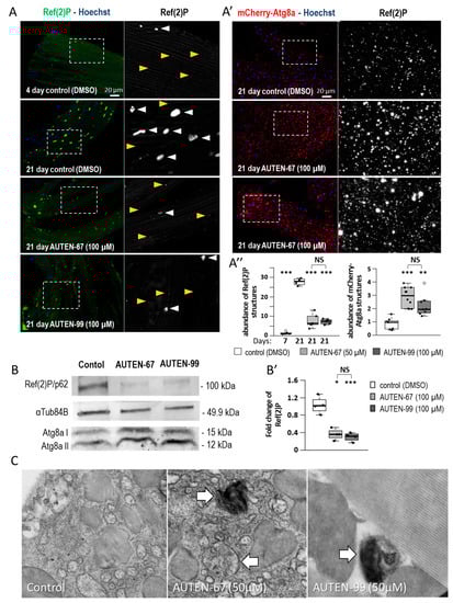 Fluorescence microscopy can directly reveal autophagic membranous structures, insoluble protein aggregates and abnormal organelles, while Western blotting is primarily suitable to detect the level of mainly soluble cytoplasmic proteins. Using the latter method, the amounts of soluble Ref(2)P and ubiquitinated proteins showed a significant decrease in 21-day-old animals treated with AUTEN molecules, as compared with the control at the same stage (Figure 2B,B′ and Figure S2A,A′). The amounts of Atg8a isoform (I and II)-positive structures were also examined. The soluble Atg8a-I is a 15 kDa large protein, while its lipidated form (termed PE-Atg8a or Atg8aII) is only 12 kDa in size []. Because Atg8a-II is also degraded by autophagy, the protein can also be considered an autophagic substrate. Upon autophagy activation, Atg8a-II levels increase. Thus, changes in autophagy activity can be inferred from the relative ratio of Atg8a-I and Atg8a-II proteins []. The current study found that the application of AUTEN-67 and AUTEN-99 each can decrease the ratio of Atg8a-I/Atg8a-II proteins compared to age-matched control (Figure 2B and Figure S2B).