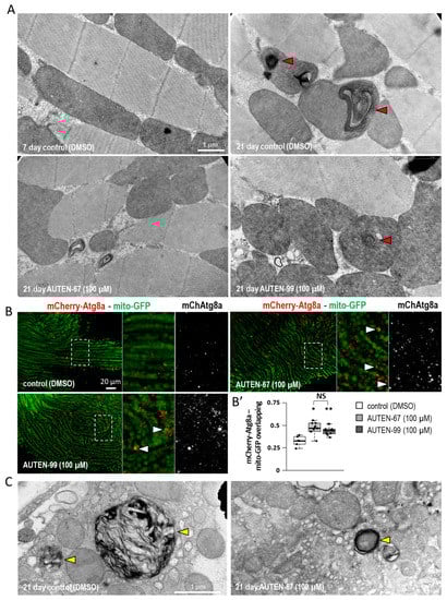 Ageing in striated muscle can also be characterized by the accumulation of damaged, non-functional mitochondria, which are often wedged into protein aggregates [,]. Using transmission electron microscopy, the IFM was examined in young (7 days old) and old (21 days old) animals treated with an AUTEN molecule. This study found that samples from old flies contain higher amounts of damaged mitochondria than those derived from younger animals (Figure 3A). Furthermore, AUTEN treatment significantly decreased the number of mitochondria with abnormal inner lamellas as compared to untreated age-matched controls (Figure 3A). The elimination of damaged mitochondria by selective autophagy is called mitophagy []. For studying the mitophagic process, a colocalization assay was performed of mCherry-Atg8a- and mito-GFP-positive structures. The results showed that colocalization of these markers is enhanced in AUTEN-treated IFM samples relative to untreated age-matched controls (Figure 3B,B′). In samples from aged (21 days old) animals, multilamellar bodies (MLB) were observed, indicating a partial digestion of mitochondria and late endosomes containing intact inner membranes (Figure 3C) []. In the untreated IFM samples, significantly larger MBLs were detected as compared to treated ones (Figure 3C). The presence of enlarged MBL structures may refer to compromised lysosomal degradation []. It can be concluded that AUTEN molecules confer a beneficial effect on the elimination of damaged mitochondria.