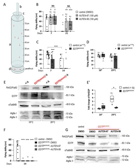 AUTEN-67 and -99 improve flying ability in Drosophila. (A) To perform a flying assay, a transparent, 80 cm high plexiglass measuring tube (a) was used. A paper covered by a transparent insect trap was placed on the inner wall of the tube. Glass vials containing animals were dropped in an inverted orientation into a drop tube on the top (b). The vial was stopped by a funnel (c) while animals kept falling into the measuring tube. Fitter animals flying towards the light got stuck to the paper covered by the insect trap close to the top of the tube, whereas old and unhealthy animals did the same close to the bottom of the tube. Animals unable to fly dropped into the paraffin oil (d) found at the bottom of the tube. Between the measurements, the insect trap was removed from the tube to determine the height at which they got stuck. Before the next measurement, animals were removed from the paper trap. The cleared trap was reinstalled inside the tube. (B) AUTEN treatments significantly improved the ability of both young (7 days) and aged (21 days) adults to fly. Animals were kept at 29 °C. (C) A hypomorphic allele of EDTP, EDTPMI08496, decreases the ability of 7 and 14 days old animals to fly. (D) EDTPMI08496 is a thermosensitive allele with a restrictive temperature of 29 °C. Development of animals occurred at a permissive temperature (18 °C) (in this way, potential developmental effects influencing flying ability were excluded); then, animals were transferred at 29 °C. Flying ability of mutant animals defective for EDTP function failed at the restrictive temperature (29 °C) only. Hence, defects in flying were not a consequence of lacking EDTP function during development. (E,E′) Proteins were extracted from animals treated as shown in panel (D). Western blot analysis reveals that amounts of EDTP lower only in EDTPMI08496 mutants maintained at 29 °C. The amount of Ref(2)P also decreased in these animals (maintained under a restrictive condition), but not in those maintained at 18 °C (a permissive condition). Similarly, the ratio of Atg8a-I/Atg8a-II levels in EDTPMI08496 mutants relative to control changed at 29 °C only. (F) Flying ability of control (treated with DMSO) and AUTEN-treated EDTPMI08496 animals at the adult age day 14. In the absence of EDTP function, AUTEN molecules cannot improve the ability of animals to fly. (G) Specificity of AUTEN-67 and -99 was also assessed by a Western blot analysis. Ref(2)P level decreased in EDTPMI08496 mutants, and this change cannot be influenced by an AUTEN treatment. Thus, these AUTEN molecules exert their effect on flying ability by inhibiting EDTP. In panels (B,D,E′,F), bars represent ±S.D. *: p < 0.05; **: p < 0.01; ***: p < 0.001. For statistics, see Section 3.