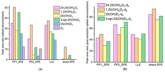 (a) Relative areas of the analyte peaks detected for spiked and then processed (4 types of SP) serum to the peaks of analytes in solvent (1 ng/mL in serum for all except D3, which had the concentration of 10 ng/mL); for D3, the values have been increased a hundred times for clarity. (b) Relative areas of the internal standards’ peaks (spiked during reconstitution) in processed serum to the peak areas of the internal standards in solvent. PP1—protein precipitation with MeOH, PP2—with MeOH and ZnSO4 (Procedure 3). The sample analysis technique was according to Section 4.2.