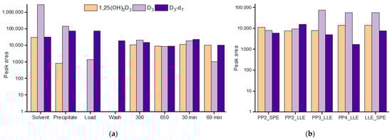 (a) Signals (logarithmic scale) of the analytes (100 pg/mL of 1,25(OH)2D3 and 100 ng/mL of D3) in the solvent and in the solutions obtained at the different stages of serum sample preparation based on protein precipitation with MeOH and ZnSO4 followed by SPE, from left to right: precipitate extract, loading fraction extract, washing fraction extract; SPE eluates obtained following two rounds of 300 µL methanol elution, and two rounds of 650 µL methanol elution; for the procedures where before loading on cartridges, the supernatants were partially evaporated during 30 or 60 min to remove methanol. (b) Signals of the analytes (logarithmic scale) in spiked (100 pg/mL of 1,25(OH)2D3 and 100 ng/mL of D3) and then processed serum. PP2_SPE and PP2_LLE—protein precipitation with MeOH and ZnSO4 followed either by SPE, or by LLE; PP3_LLE—protein precipitation with ACN and ZnSO4 followed by LLE; PP4_LLE—protein precipitation with ZnSO4 followed by LLE; LLE_SPE—LLE followed by SPE. For all samples, D3-d7 was spiked during reconstitution. The sample analysis technique was according to Section 4.2.