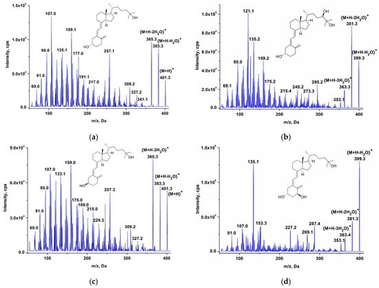 Product ion (CE = 30 V) ESI mass spectra of (a) 25(OH)D3; (b) 24,25(OH)2D3; (c) 3-epi-25(OH)D; (d) 1,25(OH)2D3.