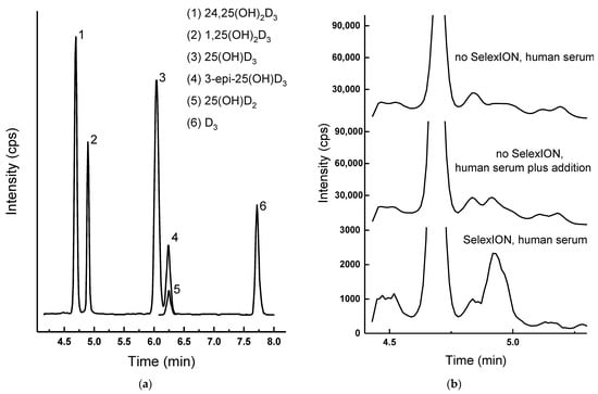 The final chromatogram, combining all main vitamin D metabolites, is presented in Figure 4a. 24,25(OH)2D3 and 1,25(OH)2D3 are separated, as well as the epimers, which became possible thanks to the addition of acetonitrile (Table 2). This is the mandatory option in routine clinical methods for the quantification of vitamin D metabolites in human serum. Meanwhile, the proposed method is actively used for these purposes [27]. The following section aims to demonstrate how this approach was developed and why it can safely be called robust.