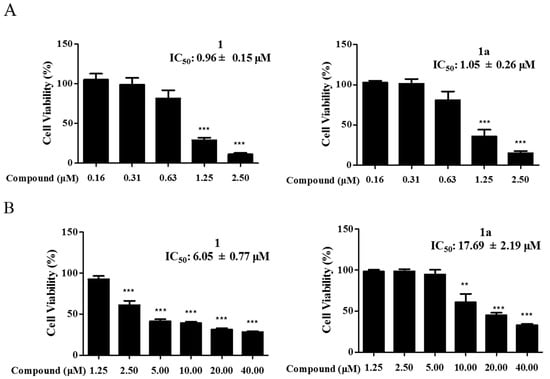 Compounds 1 and 1a inhibit the proliferation of HEL cells and LX-2 cells. (A) HEL cells were incubated with 1 and 1a. (B) LX-2 cells were incubated with 1 and 1a. Cell activity was assessed using the CCK-8 kit. Data were collected from three independent experiments. Error bars represent standard deviation. Two-tailed p values were derived from unpaired Student’s t test. “**”, p < 0.01; “***”, p < 0.001.
