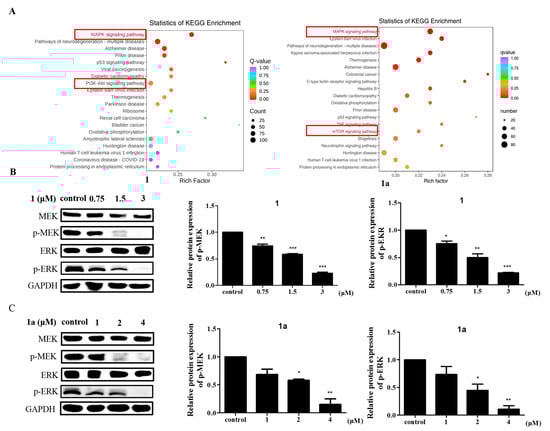 To elucidate the molecular mechanisms of 1 and 1a in leukemia, RNA-seq analysis was used to detect differential gene expression after compound treatment (Table S2) [], and the twenty most significantly enriched pathways were identified by KEGG enrichment analysis []. The MAPK signaling pathway was the most significantly enriched pathway in both 1-treated cells and 1a-treated cells vs. controls cells (Figure 4A). The MAPK family is a group of serine/threonine protein kinases that mediate intracellular signaling and are important transmitters of signals from the cell surface to the interior of the nucleus. The MAPK signaling pathway consists of three main MAPK subfamilies, including MAPK14, the c-Jun N-terminal kinase or stress-activated protein kinase (JNK or SAPK), and the extracellular signal-regulated kinases (ERK MAPK, Ras/Raf1/MEK/ERK). There is increasing evidence that activation of the ERK MAPK pathway is involved in the pathogenesis and progression of human cancers and is one of the most important pathways for cell proliferation [].