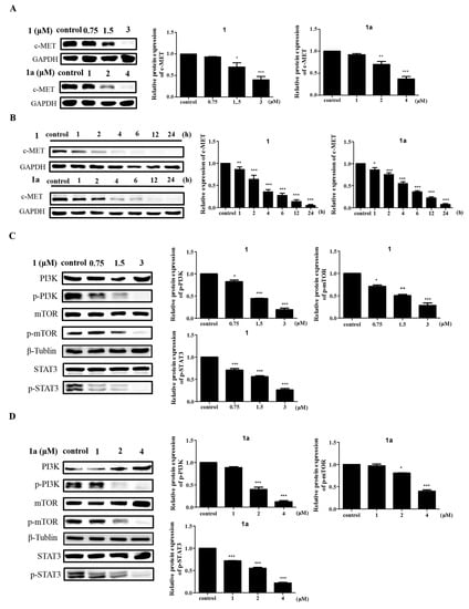 Compounds 1 and 1a induce HEL cell apoptosis via the c-MET signaling pathway. (A) Both 1 and 1a decrease c-MET protein expression in a dose-dependent manner. (B) Both 1 and 1a decrease c- MET protein expression in a time-dependent manner. (C,D) Both 1 and 1a decrease the phosphorylation levels of downstream proteins in the c-MET signaling pathway in a dose-dependent manner. “*”, p < 0.05; “**”, p < 0.01; “***”, p < 0.001.