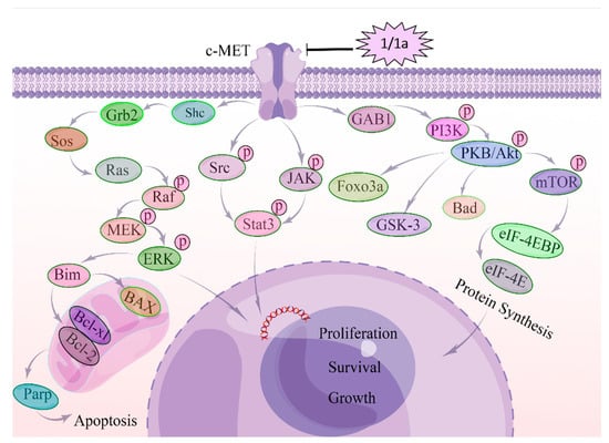 Molecular mechanism of c-MET regulating HEL cells after the treatment with compounds 1 and 1a. c-MET is overactivated in human erythroid leukemia cell cells (HEL). After the treatment with 1 and 1a, the mRNA expression level and protein expression level of c-MET were suppressed, and subsequently, the c-MET homodimerization and autophosphorylation were affected. Then, GAB-1, Shc, Grb-2, and STAT3 were suppressed. Grb2 inhibits SOS, SOS suppresses RAS, and then RAS inhibits RAF, MEK, and ERK/MAPK. Suppressed ERK/MAPK can modulate transcription factors to regulate cell behaviors. Suppressed GAB-1 inhibits AKT, PKB, and mTOR to regulate transcription factors.
