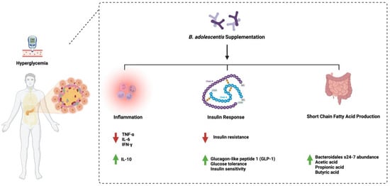 | Bifidobacterium adolescentis | Glucose Lipid metabolism Inflammatory markers | Oral gavage Intraperitoneally | 8 | High-fat diet | 12 weeks | -Alleviate insulin resistance -Restore gut microbiota homeostasis -Increase the abundance of SCFA-producing flora -Alleviate inflammation by reducing the concentration of TNF-a, IL-6, and IFN-Y | Biochemical analysis Histopathological analysis SCFA analysis Polymerase chain reaction | -C57BL/6J mice | -Pancreatic cells -Hepatic cells | [44] |
