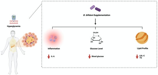 | Bifidobacteriumbifidum | Glucose Lipid metabolism Inflammatory markers | Orally | 1 × 107 colony-forming units/mL | NA | 28 days | -Administration of B. bifidum significantly reduced serum fasting blood glucose -It reduced the level of total cholesterol, triglycerides, low-density lipoproteins, and very low-density lipoproteins and enhanced the level of high-density lipoproteins -Reduced the activity of lipid peroxidation -Enhanced the activity of glutathione, superoxide dismutase, catalase, glutathione peroxidase, glutathione reductase, and glutathione-S-transferase | Glucose tolerance test Oxidative stress enzymatic assay | -Male Wistar rats | -Pancreatic cells -Hepatic cells | [50] |