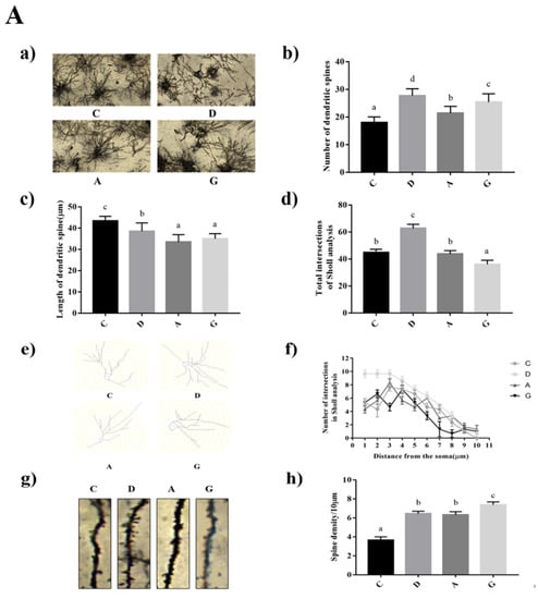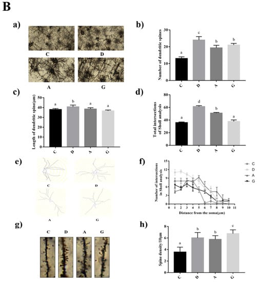 In the hippocampus, the number of dendritic spines and the number of dendritic spines per unit length in the music groups were significantly higher than those in group C (p < 0.05). The length of hippocampal dendritic spines in the music groups was significantly lower than that in group C (p < 0.05) (Figure 2A). The number of intersection points between dendrites and concentric circles in group D was significantly higher than that in other groups (p < 0.05), but there was no significant difference in the number of intersection points between group G, group A and group C (p > 0.05) (Table S2).