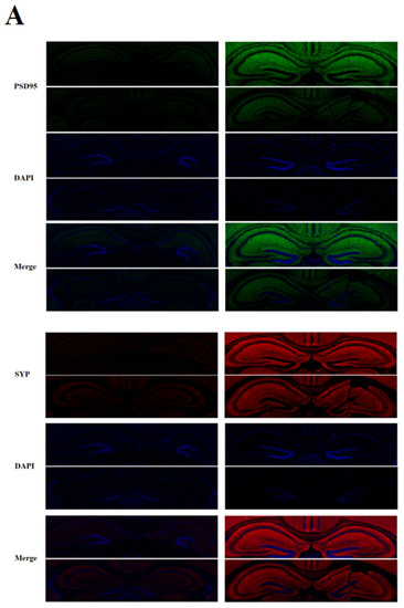 The brain sections were washed three times with 0.01M PBS solution; then the sections were placed in 4% polyformaldehyde for 20 min. After that, they were sealed with 3% hydrogen peroxide for 20 min. Finally, the first step was repeated three times. Completing the above steps, the brain tablet was incubated for 1 h in a closed buffer containing 10% normal goat serum and 0.1% TritionX-100. The closure was completed; the PSD95 (1:1000, Cell Signaling Technolo Gy, Inc., Boston, USA) and SYP (1:800, Cell Signaling Technology, Inc., Boston, USA) antibodies spent the night in the 4 °C environment. The next day, the purpose of the 0.01M Phosphate Buffered Saline (PBS) solution was cleaned three times to remove uncombined anti-distance. After staining, the anti-quenching agent droplets were added to the slice and then sealed. Panoramic images of brain tissue were obtained using a digital slicing scanner panoramic multilayer. Finally, Image J software was used to measure the integral light density and fluorescence colocation analysis.