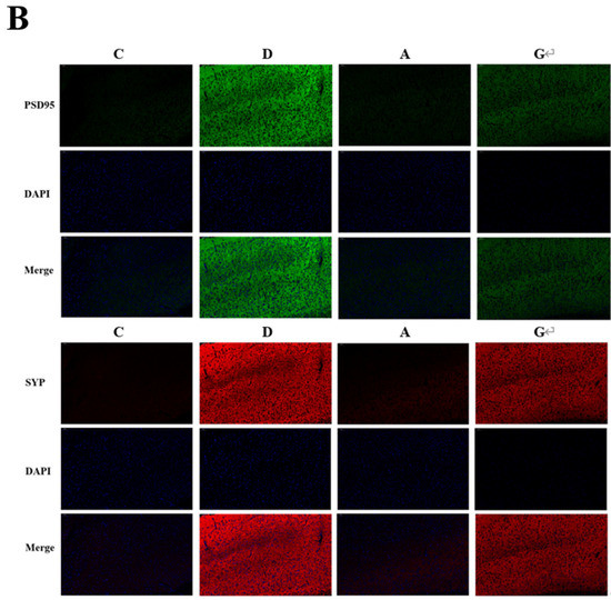 In the hippocampus (Figure 3A) and prefrontal cortex (Figure 3B) of mice, the protein expression levels of PSD95 and SYP in the music groups were significantly higher than those in group C (p < 0.05). The protein expression levels of PSD95 and SYP in group A and group G were significantly lower than those in group D (p < 0.05). The fluorescence intensity of PSD95 and SYP in group G was significantly higher than that in group A (p < 0.05). The positive rates of PSD95 and SYP were shown in Table S3.
