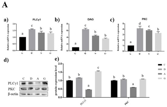 In the hippocampus of mice, the expression levels of PLCγ1, DAG and PKC mRNA in the music groups were significantly higher than those in group C (p < 0.05). The PLCγ1, DAG and PKC mRNA expression levels in group D were significantly higher than those in the other three groups (p < 0.05). The expression levels of PLCγ1 and DAG mRNA were not significantly different between group A and group G (p > 0.05). The expression level of PKC mRNA in group A was significantly higher than that in group G (p < 0.05). PLCγ1 protein expression level in group G was significantly higher than that in the other three groups (p < 0.05); PLCγ1 protein expression level in group A was significantly lower than that in the other three groups (p < 0.05); and there was no significant difference between group D and group C (p > 0.05). The protein expression level of PKC in group A was significantly lower than that in the other groups (p < 0.05), but there was no significant difference among the other three groups (p > 0.05) (Figure 5A).