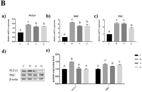 In the prefrontal cortex of mice, the expression levels of PLCγ1, DAG and PKC mRNA in the music groups were significantly higher than those in group C (p < 0.05). The PLCγ1, DAG and PKC mRNA expression levels in group D were significantly higher than those in the other three groups (p < 0.05). The PLCγ1 protein expression level in group D was significantly higher than that in the other three groups (p < 0.05), but there was no significant difference among the other three groups (p > 0.05). The PKC protein expression level of group C was significantly lower than that of the other three groups (p < 0.05); the PKC protein expression level of group A was significantly lower than that of group D and group G (p < 0.05); and there was no significant difference between group D and group G (p > 0.05) (Figure 5B).