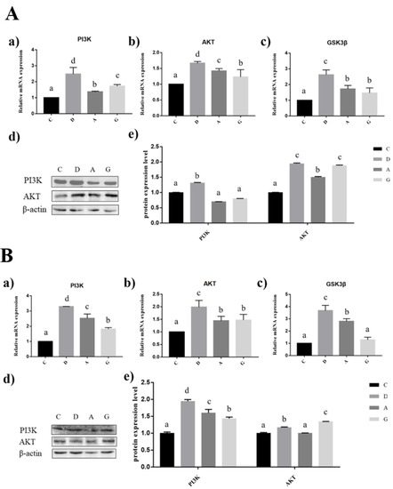 In the prefrontal cortex of mice, the mRNA expression levels of PI3K, AKT and GS3Kβ in group D were significantly higher than those in the other three groups (p < 0.05); the PI3K and AKT in group C were significantly lower than those in group A and group G (p < 0.05); and the PI3K mRNA expression in group A was significantly higher than that in group G (p < 0.05). The mRNA expression level of AKT was not significantly different between group A and group G (p > 0.05). The GS3Kβ mRNA expression level of group C and group G was significantly lower than that of group A (p < 0.05), and there was no significant difference between group C and group G (p > 0.05). The PI3K protein expression level of group D was significantly higher than that of the other three groups (p < 0.05); the PI3K protein expression level of group A was significantly lower than that of the other three groups (p < 0.05); and group A was significantly higher than group G (p < 0.05). The expression level of AKT in group G was significantly higher than that in the other three groups (p < 0.05), and that in group D was significantly higher than that in group C and group A (p < 0.05); however, there was no significant difference between group C and group A (p > 0.05) (Figure 6B).