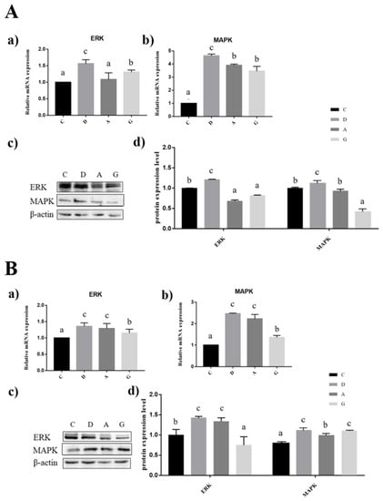 In the prefrontal cortex of mice, the expression levels of MAPK and ERK mRNA in group A were significantly lower than those in the other three groups (p < 0.05). The expression levels of MAPK and ERK mRNA in group G were significantly lower than those in group D and group A (p < 0.05), but there was no significant difference between group D and group A (p < 0.05). The expression level of ERK protein in group D and group A were significantly higher than that in other groups, and the expression level of ERK protein in group C was significantly higher than that in group G (p < 0.05); however, there was no significant difference between group D and group A (p < 0.05). The expression level of MAPK protein in group D and group G were significantly higher than that in other groups (p < 0.05), the expression level of MAPK protein in group C was significantly higher than that in group A (p < 0.05), but there was no significant difference between group D and group G (p < 0.05) (Figure 7B).