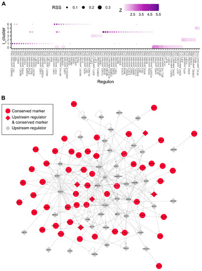 - Aibar, S.; Gonzalez-Blas, C.B.; Moerman, T.; Huynh-Thu, V.A.; Imrichova, H.; Hulselmans, G.; Rambow, F.; Marine, J.C.; Geurts, P.; Aerts, J.; et al. SCENIC: Single-cell regulatory network inference and clustering. Nat. Methods 2017, 14, 1083–1086. [Google Scholar] [CrossRef] [PubMed]