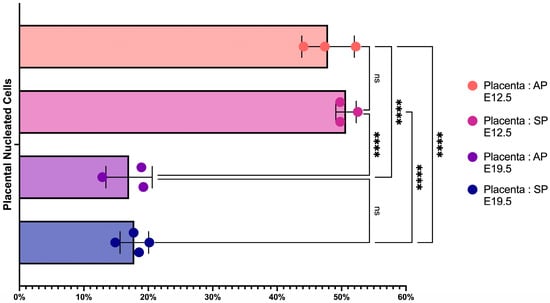 We measured the percentage of erythroid cells in the placenta at E12.5 and E19.5 in both AP and SP (Figure 1) and found a significant 2.5-fold decrease in the percentage of erythroid cells in the placenta at E19.5 compared to E12.5, regardless of the type of pregnancy (AP or SP) (Figure 2).