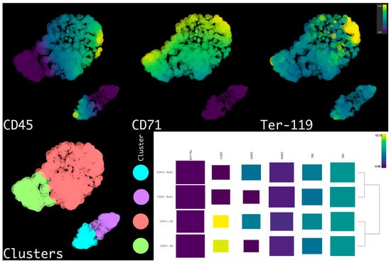 We then applied HSNE dimensionality reduction of erythroid cells’ flow cytometry data (FSC, SSC, CD44, CD45, CD71, and Ter-119) following arcsinh-transformation with automated co-factors (to automatically separate marker-expressing and marker non-expressing cells) and fdaNorm-normalization (to remove flow cytometry’s batch effects and normalize data). The results of the clustering reveal the presence of CD45− and CD45+ erythroid cells (CD71+) and CD45− and CD45+ reticulocytes (CD71−) (Figure 3).