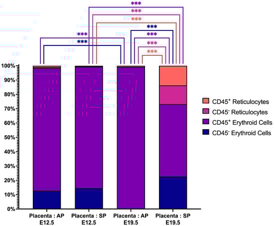 Analysis of erythroid cells showed that CD45+ erythroid cells are predominant in the placenta and the presence of statistically significant changes in the structure of the erythron—we found that (a) there is a higher number of CD45+ erythroid cells and both CD45− and CD45+ reticulocytes in AP E19.5 compared to E12.5 and (b) there is a lower number of CD45+ erythroid cells in SP E19.5 compared to E12.5 (Figure 4).