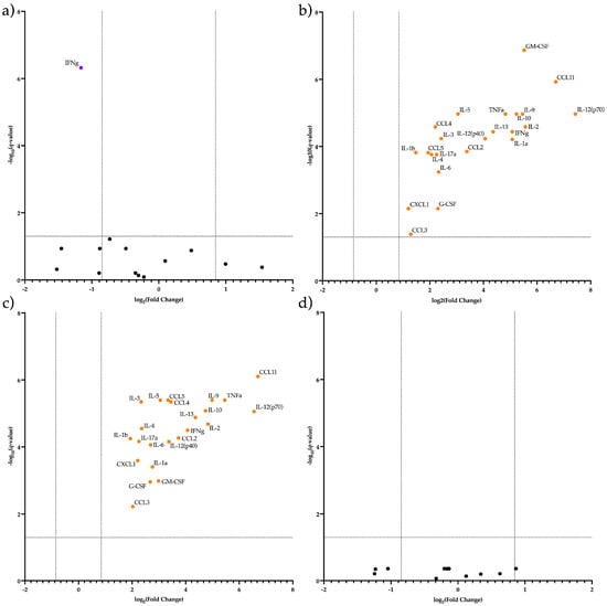 Differentially Secreted Cytokines’ Volcano plot of: (a) CECs from E19.5 SP Placenta vs. CECs from E19.5 AP Placenta (b) CECs from E12.5 AP Placenta vs. CECs from E19.5 AP Placenta, (c) CECs from E12.5 AP Placenta vs. CECs from E12.5 SP Placenta, (d) CECs from E12.5 AP Placenta vs. CECs from E12.5 SP Placenta.