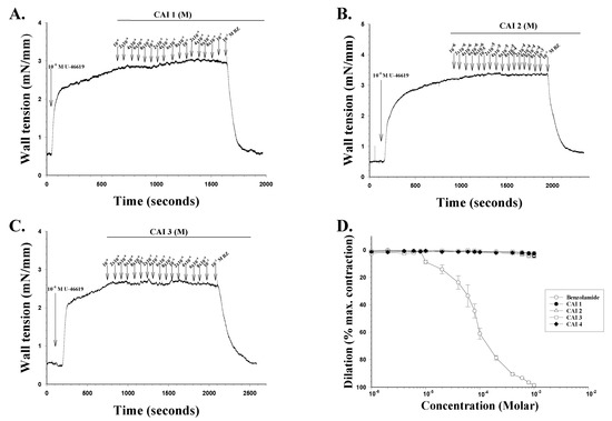 Continuous recordings of wall tension in all four chambers, and the temperature of the PSS as monitored by the thermal probe were acquired with LabChart Pro as a five-channel continuous record (ADInstruments, Oxford, UK). Once the temperature in the recording baths had reached 37 °C, the vessel segments were allowed to stabilize in there for 30 min. The wall tension normalization procedure was then carried out in accordance with the manufacturer’s (DMT A/S) protocol, taking into account the length of each segment as described in detail previously [5,6]. Experiments on the vessel segments were then initiated, and first, the vessels were pre-contracted with the thromboxane A2 analog U-46619 (9,11-dideoxy-9 a,11a methanoepoxy prostaglandin F2a) (Cayman Chemicals Inc, Tallinn, Estonia) and dissolved in double distilled water to yield a stock solution of 10−3 M. When adding U-46619 to the recording bath from the stock solution of 10−3 M, the final concentration in the 10 mL bath was 10−6 M. The maximum increase in wall tension induced by 10−6 M U-46619 varied between segments, but if contractions were below 1.0 mN/mm in an experiment, then the results were discarded. Once the increased wall tension had reached a peak which usually took several minutes, the CAI compound that was to be tested in each case was added to the bath. All of the CAIs tested in this study were dissolved in DMSO to stock solutions of 0.1 M and then diluted to the final concentration desired in the bath of the recording chamber. For each compound examined, concentration–response curves were generated from all vessel segments tested by adding first the compound to the bath to a final concentration of 10−6 M as the lowest value in all experiments and then adding the next dose to increase the final concentration at that point (e.g., 2 × 10−6 M) up to a cumulative final concentration of 10−3 M as the highest dose tested. At least a minute passed between increases in concentration.