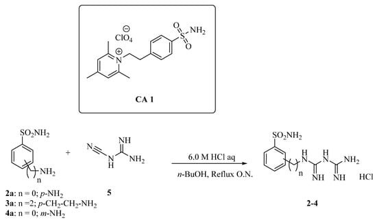CAIs 2 and 4 were obtained similarly to CAI 3 [18] by addition of the commercially available sufanilamide and metanilamide to cyanoguanidine in n-butanol using a stoichiometric amount of hydrochloric acid solution in water (Scheme 1).