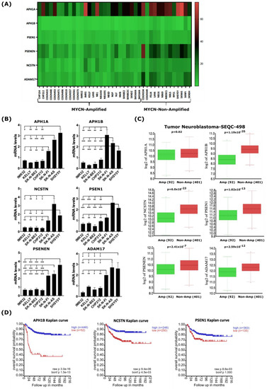 MYCN amplification correlates with reduced expression of genes encoding γ-secretase subunits and ADAM17 in human NB cell lines and primary tumors. (A) Heatmap analysis of mRNA levels of the γ-secretase complex genes and ADAM17 in the 39-human NB-cell-line dataset. (B) RT-qPCR analysis of baseline expression levels of genes of the γ-secretase complex and ADAM17 in a set of human NB cell lines. Error bars in panel represent the standard deviation of three independent biological experiments. p-value was calculated using a two-tailed, unpaired student t-test. * p-value ≤ 0.05; ** p-value ≤ 0.01; *** p-value ≤ 0.001. (C) In silico analysis of mRNA levels of γ-secretase complex genes and ADAM17 in primary NB tumors with and without MYCN amplification. Statistical analysis was performed using one-way ANOVA. (D) Kaplan–Meier-analysis overall survival curve from the Tumor Neuroblastoma-SEQC-498 study based on mRNA expressions of genes of the γ-secretase complex, APH1B, NCSTN, and PSEN1. Statistical analysis was performed using Bonferroni correction of raw p-values.