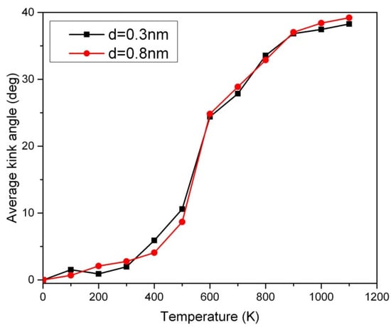 The Peierls transition is a phenomenon that occurs in certain one-dimensional crystalline solids []. It involves a sudden change in the lattice structure at the Peierls transition temperature []. At its most basic level, the Peierls transition mainly results from a competition between two forces: the kinetic energy and lattice energy of the crystalline materials. When the lattice energy is strong enough, it will cause a structural rearrangement of the crystalline materials, resulting in a decrease in its overall conductivity (or opening a band gap as a semiconductor). In contrast, when the temperature is high enough, the fast kinematic motion of atoms will cause them to break away from the structural pattern they had formed at low temperatures, allowing them to return to the metallic state []. However, the carbon chain prefers to undergo an inverse Peierls transition in which it favors the metallic (semiconducting) state below (above) the Peierls transition temperature []. The Peierls transition of short carbon chains has been probed by our new method based on the temperature sweep analysis in Figure 4. The slope or inflection point in Figure 4 can be used for the detection of the Peierls transition. Below the Peierls transition temperature, no significant disorder in the 50-CNA was observed, as indicated by an average kink angle of less than 10 degrees. This is attributed to insufficient Boltzmann excitation in low-temperature regimes. However, a disordered kink structure is observed above the Peierls transition temperature [,] as evidenced by a sharper upturn at ~500 K in Figure 4. Interestingly, using the Boltzmann factor alone is not sufficient in explaining the rapid increase in the average kink angle across the phase transition. The Peierls instability appears to actuate the changes in the period of the one-dimensional nanowire that presumably forms kinks. Therefore, the rigorous atomic motion due to the Boltzmann excitation in combination with the increase in entropy across the Peierls transition causes carbon atoms to align more chaotically. The disorder in the 50-CNA starts to saturate above 800 K due to the stabilization of thermal oscillations [].