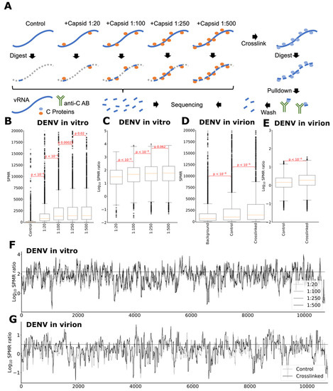 Footprinting of C protein binding on DENV genomic RNA. (A) Two distinct experiments to determine C protein interaction locations with genomic RNA were conducted on in vitro transcribed RNA and inside mature virions. (B) Abundance of reads after SPMR normalization in DENV and (C) ratio of reads abundance over control show that at a molar ratio of 1:250 the genomes are saturated with C protein, indicating that the saturation point lies at or below this level. (D) highlights absolute signal observed for crosslinking in virion and (E) indicates ratios for control and crosslinked experiments over background. Localization of the binding signal along the DENV genome is shown in (F) for the in vitro transcribed genomic RNA and (G) for the in virion crosslinked experiment.