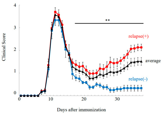 Disease course of RR-EAE. Progression of RR-EAE was daily monitored and scored on disease severity on a clinical scale from 0 to 5, as described in the text. EAE symptoms in relapse (−)/resistant mice (closed blue square) were significantly milder than that in relapse (+) mice (closed red circle). Average clinical score is shown in black line (closed triangle). Note all mice got severe EAE at the 1st episode. The mean clinical score (±SEM) is shown. ** p < 0.01 is shown (relapse (+) vs. relapse (−)).
