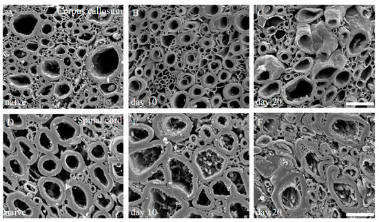 - Nomura, T.; Bando, Y.; Bochimoto, H.; Koga, D.; Watanabe, T.; Yoshida, S. Three-dimensional ultra-structures of myelin and the axons in the spinal cord: Application of SEM with the osmium maceration method to the central nervous system in two mouse models. Neurosci. Res. 2013, 75, 190–197. [Google Scholar] [CrossRef] [PubMed]