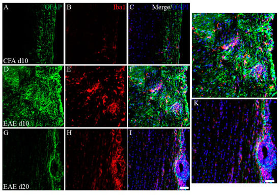 Increasing EAE-induced inflammatory cells at day 10 (peak disease). Frozen cross sections of spinal cords from CFA-injected control mice at day 10 post-immunization (1st episode, (A–C)) and PLP-induced EAE mice at day 10 (D–F,J) and day 20 after PLP-immunization (2nd episode, (G–I,K)) were stained with anti-GFAP (a marker for astrocytes, (A,D,G,J,K), green), anti-Iba1 (a marker for microglia/macrophage, (B,E,H,J,K), red) antibodies with DAPI ((C,F,I–K), blue). Merged images are shown (C,F,I–K). Images with a high-power magnification of panels (F,I) are shown (J,K). Scar bars: 500 μm.