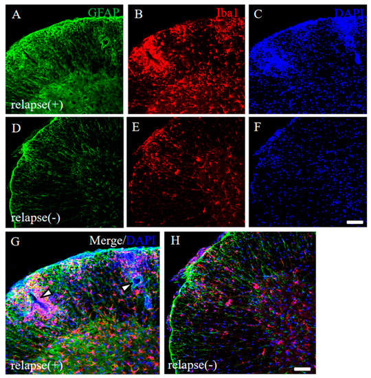 Pathological differences between RR-EAE and the resistant mice. Frozen cross sections of spinal cords from RR-EAE (relapse (+), (A–C)) and the resistant (relapse (−), (D–F)) mice at day 35–40 post-immunization were stained with anti-GFAP ((A,D), green) and anti-Iba1 ((B,E), red) antibodies. These sections were also stained with DAPI ((C,F), blue). Images with a high-power magnification of panels (A–C,D–F) are shown (G,H). (G) White arrowheads show severe inflammatory sites by recall infiltrating immune cells from the periphery. Scar bars: 500 μm.
