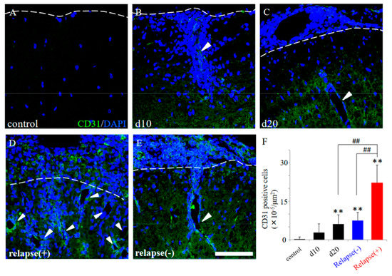 EAE-induced angiogenesis in the RR-EAE and the resistant mice. Frozen cross sections of spinal cords from the RR-EAE mice were stained with anti-CD31 antibody (a marker for angiogenesis, green). These sections were also stained with DAPI (blue). Each time course (control (A), day 10 (d10, (B)), day 20 (d20, (C)) are shown. Representative results from RR-EAE ((D), relapse (+)) and the resistant ((E), relapse (−)) are also shown. White arrowheads show a representative angiogenesis stained with anti-CD31 antibody. Panel (F) revealed that the number of CD31+ve cells in the RR-EAE, but not in the resistant mice, were significantly increased from remitting to relapse phase. ** p < 0.01 (vs. control), ## p < 0.01 (vs. relapse (+)) are shown. Scar bar: 50 μm.