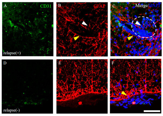 The molecular mechanisms related to angiogenesis and the BBB breakdown followed by the peripheral inflammatory cell infiltration were further investigated. As shown in Figure 5, the increasing numbers of angiogenesis indicated by immunostaining with the anti-CD31 antibody were observed in the relapse mice, but not in the resistant mice. In addition, an accumulation of peripheral inflammatory cells was observed in the sites where the perivascular astrocyte end feet were not stained with the anti-GFAP antibody around CD31+ve endothelial cells (Figure 6B,C, white arrowhead). In contrast, no inflammatory cell infiltration was observed in the sites where the perivascular astrocyte endo feet were tightly stained with the anti-GFAP antibody in the relapse mice (Figure 6E,F, yellow arrowhead). In the resistant mice, peripheral inflammatory cells remained on the meninges by the presence of astrocyte in the tight (Figure 6E,F).