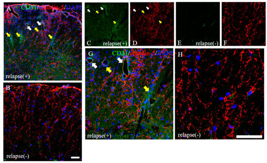Distribution of claudin-5 is sustained in the resistant, but not in the RR-EAE, mice. Frozen cross sections of spinal cords from the RR-EAE (relapse (+)) and the resistant (relapse (−)) mice were stained with anti-CD31 ((C,E), green) and anti-claudin-5 ((D,F), red) antibodies. These sections were also stained with DAPI (blue). Merged images are shown (A,B,G,H). Images with a high-power magnification of panels (A,B) are shown (G,H). Yellow arrows show CD31+ve angiogenesis in areas with attenuated claudin-5 expression, indicating infiltrating sites of peripheral inflammatory cells. White arrows shows CD31+ve angiogenesis in area with sustained claudin-5 expression, indicating inhibiting inflammatory cells from the periphery. Scar bars: 50 μm.
