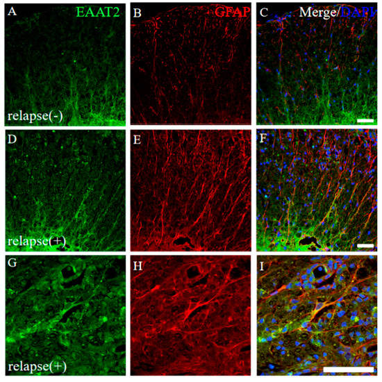Higher expression of EAAT2 was observed in the RR-EAE mice rather than the resistant mice. Frozen cross sections of spinal cords from the RR-EAE (relapse (+)) (D–I) and the resistant (relapse (−)) mice (A–C) were stained with anti-EAAT2 (a glutamate transporter on astrocytes; (A,D,G), green) and anti-GFAP ((B,E,H), red) antibodies. These sections were also stained with DAPI (blue). Merged images are shown (C,F,I). Images with a high-power magnification of panels (D–F) are shown (G–I). Scar bars: 50 μm.