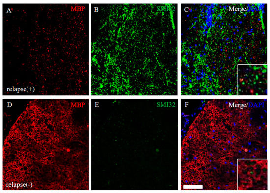 Severe demyelination and axonal degeneration were observed in the RR-EAE, but not in the resistant mice. Frozen cross sections of spinal cords from the RR-EAE (relapse (+)) (A–C) and the resistant (relapse (−)) mice (D–F) were stained with anti-MBP ((A,D), red) and anti-SMI32 ((B,E), green) antibodies. These sections were also stained with DAPI (blue). Merged images are shown (C,F). Images with a high-power magnification of panels are shown in the inset, respectively. Scar bar: 50 μm.