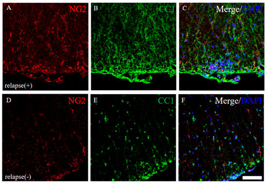 Immunoreactivity for oligodendroglial and their progenitor was changed in RR-EAE mice. Frozen cross sections of spinal cords from the RR-EAE (relapse (+)) (A–C) and the resistant (relapse (−)) mice (D–F) were stained with anti-NG2 ((A,D), red) and anti-CC1 ((B,E), green) antibodies. These sections were also stained with DAPI (blue). Merged images are shown (C,F). Scar bar: 50 μm.