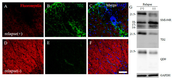 21.5 kDa isoform of MBP during relapsing phase was degenerated in RR-EAE. RR-EAE and resistant mice were perfused and immunostain was performed with Frozen cross sections of spinal cords from the RR-EAE (relapse (+)) (A–C) and the resistant (relapse (−)) mice (D–F) were stained with Fluoromyelin ((A,D), red) and anti-7D2 (a marker for 21.5 kDa isoform of MBP; (B,E), green) antibody. These sections were also stained with DAPI (blue). Merged images are shown (C,F). Scar bar: 50 μm. (G) Immunoblot analysis stained with anti-SMI-94R (a marker for MBP), anti-7D2 antibody, anti-QD9 antibody (a marker for degenerating MBP), and anti-GAPDH antibody (as an internal control). Note that anti-7D2 antibody specifically recognizes only 21.5 kDa isoform of MBP.