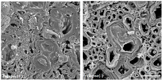 The ultrastructural myelin abnormalities and axonal degeneration were frequently observed in the relapsing EAE. The SEM analysis with osmium-maceration method showed differences ultrastructural myelin abnormalities and axonal degeneration between relapsing EAE mice (A) and the resistant mice (B).
