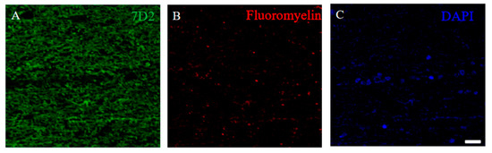 21.5 kDa isoform of MBP was detected in the demyelinating lesion of autopsied human MS patient’s brain. Immunostaining was performed on the autopsied human MS brain with anti-7D2 antibody ((A), green), Fluoromyelin ((B), red), and DAPI ((C), blue).