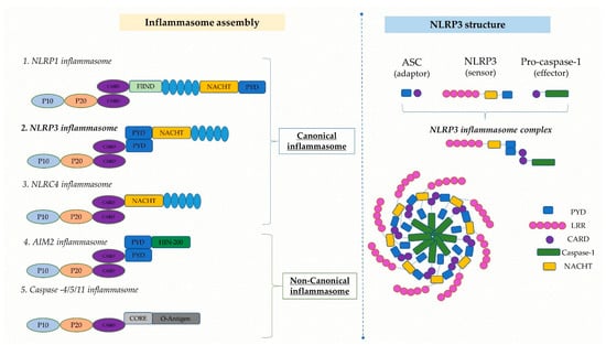 Inflammasomes are intracellular protein complexes that are formed as pattern recognition receptors (PRRs) and interact either with DAMPs or with pathogen-associated molecular patterns (PAMPs) []. Examples of intrinsic molecules known as DAMPs that are generated in response to injury or distress include extracellular adenosine triphosphate (ATP) and cholesterol crystals (CCs). PAMPs are molecules of external origins, such as toxins generated by bacteria and viruses []. Although the number of other recognition receptors identified as having the ability to trigger inflammasome generation is consistently increasing, currently only nucleotide-binding oligomerization domain (NOD)-like receptor (NLR) family pyrin domain (PYD) containing 1 (NLRP1), NLRP3, NLR family caspase-recruitment domain (CARD) containing 4 (NLRC4), absent in melanoma 2 (AIM2) and pyrin are accepted as inflammasome receptors [,].