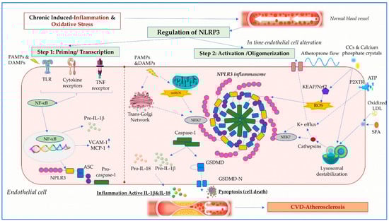 By modulating the NLRP3 inflammasome, the interaction between oxidative stress (OS) and inflammation through cytokine release is likewise documented [,]. As a result of a myriad of conditions, secondary dysfunctional endothelium implies a change from a quiescent to a proinflammatory phenotype and serves as the first stage in the development of an atherosclerotic lesion.